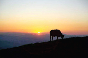 南臺也被稱為花臺,各種野花競相開放,清新雅致。遠(yuǎn)眺峰巒疊嶂,漸入云端,近觀,地上完全鋪上了綠毯,牛馬自在地曬著太陽吃著美味肥草。南臺景色優(yōu)美,但師傅們很清苦,夏天也身穿棉袍,因為寺廟里比較陰冷。山上缺水,終年靠接雨水喝為生。我們坐著朋友的紅色越野車下山,擺出各種pose,留下了與綠地、藍(lán)天、白云、奶牛在一起的絕美畫面。