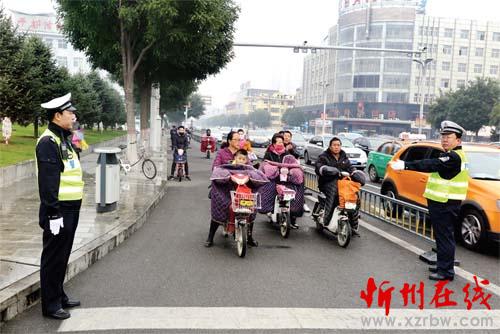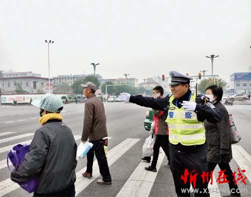 圖四:10 月15 日,交警在七一路與利民街十字路口引導(dǎo)行人過馬路