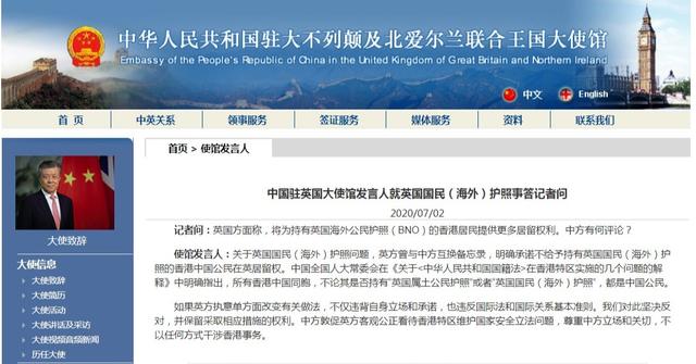 當(dāng)?shù)貢r(shí)間7月2日,中國駐英國大使館發(fā)言人就英國國民(海外)護(hù)照事答記者問時(shí)表示,關(guān)于英國國民(海外)護(hù)照問題,英方曾與中方互換備忘錄,明確承諾不給予持有英國國民(海外)護(hù)照的香港中國公民在英居留權(quán)。中國全國人大常委會在《關(guān)于〈中華人民共和國國籍法〉在香港特區(qū)實(shí)施的幾個(gè)問題的解釋》中明確指出,所有香港中國同胞,不論其是否持有“英國屬土公民護(hù)照”或者“英國國民(海外)護(hù)照”,都是中國公民。