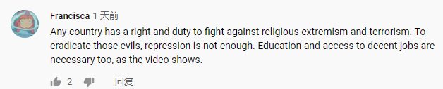 “任何國家都有權(quán)利和義務(wù)打擊宗教極端主義和恐怖主義。要根除這些邪惡……教育和獲得體面工作的機(jī)會也是必要的?!苯?,一名海外網(wǎng)友Francisca在看完中央廣播電視總臺旗下CGTN播出的《巍巍天山——中國新疆反恐記憶》紀(jì)錄片后這樣評價。