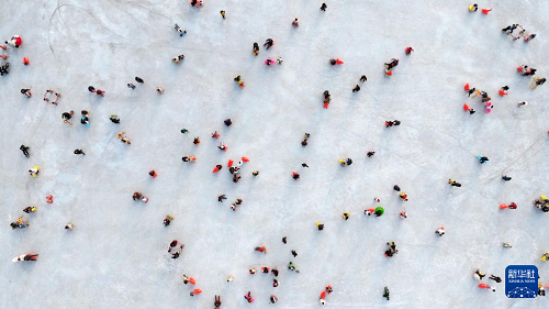 1月17日,市民在銀川文旅集團(tuán)覽山公園落日冰場(chǎng)游玩(無人機(jī)照片)。(新華社記者 王鵬 攝)