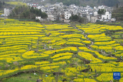 眼下,安徽省宣城市績溪縣家朋鄉(xiāng)幸福村的油菜花田進入盛花期,大批游客來此踏青賞花。