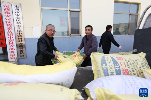 3月24日,甘肅省定西市安定區(qū)城市管理局駐村幫扶工作隊的工作人員在葛家岔鎮(zhèn)中寨村幫助村民裝運農(nóng)資。(新華社發(fā) 王克賢 攝)