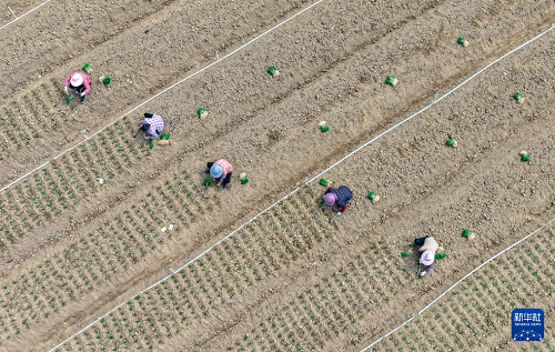 3月24日,廣西南寧市邕寧區(qū)蒲廟鎮(zhèn)農(nóng)民在田園里種植蔬菜(無人機照片)。(新華社發(fā) 方永濤 攝)