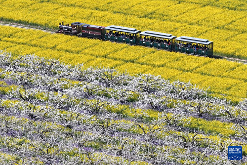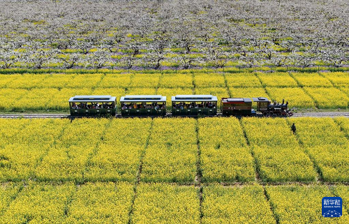 4月6日,游客乘觀光小火車從河北省晉州市周家莊鄉(xiāng)第九生產隊梨園旁經過(無人機照片)。(新華社記者 楊世堯 攝)