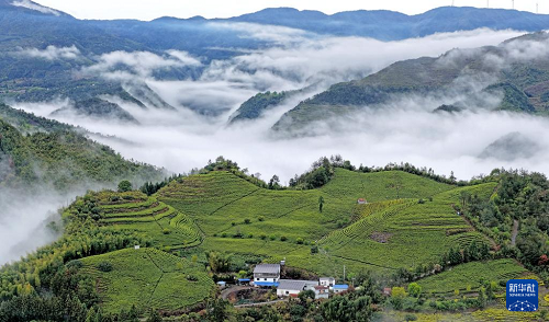 4月12日拍攝的浙江省臺(tái)州市仙居縣橫溪鎮(zhèn)陽(yáng)峰山生態(tài)茶園(無(wú)人機(jī)照片)。(新華社發(fā) 王華斌 攝)