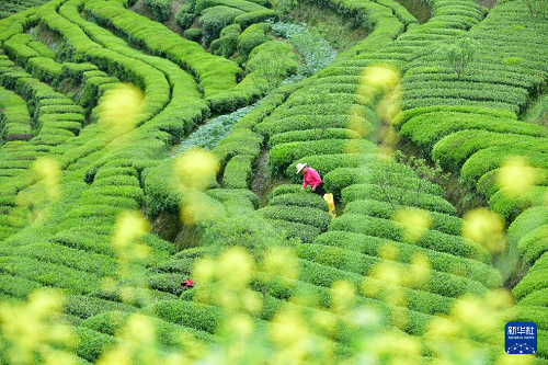 4月12日,在湖北省十堰市鄖陽(yáng)區(qū)青山鎮(zhèn)九里崗村茶葉基地,采茶工在采茶葉。(新華社發(fā) 曹忠宏 攝)