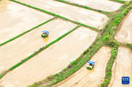 4月11日,湖南省衡陽市祁東縣金橋鎮(zhèn)村民駕駛插秧機進行早稻插秧工作。(新華社發(fā) 曹正平 攝)