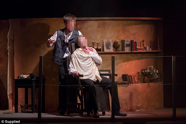 這周三,新西蘭的一個(gè)私立學(xué)校的劇團(tuán)也排了這部劇,然而正是演出的時(shí)候,這個(gè)割喉場(chǎng)景出現(xiàn)了意外。這兩名扮演受害者的學(xué)生演員被當(dāng)場(chǎng)割喉,血濺舞臺(tái)。因?yàn)榘凑站巹〉牧鞒蹋瑑擅芎φ弑桓詈砗缶捅煌ㄟ^(guò)椅子下面的機(jī)關(guān)門(mén)送到了舞臺(tái)下,整部劇之后還照常演出。臺(tái)下的不少觀眾之后接受采訪時(shí)表示,他們當(dāng)時(shí)還以為劇組用的是假血,還在感嘆他們做效果做的如此逼真。事后才知道,那些都是真血。