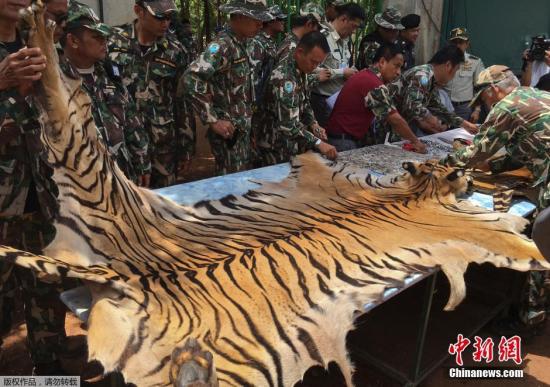 資料圖:當(dāng)?shù)貢r間6月2日,據(jù)外媒報道,泰國野生動物保護機構(gòu)又在涉事寺廟中發(fā)現(xiàn)了虎皮和大批用老虎尸體制作的護身符。