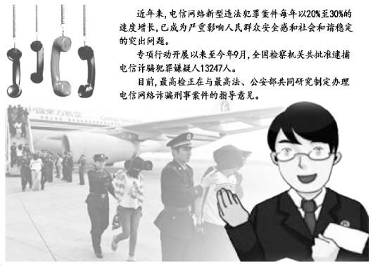 《法制日?qǐng)?bào)》記者從最高人民檢察院與公安部近日聯(lián)合召開(kāi)的電信網(wǎng)絡(luò)新型違法犯罪重點(diǎn)整治、突出地區(qū)督導(dǎo)會(huì)上了解到,被掛牌的7個(gè)重點(diǎn)地區(qū)和5個(gè)突出地區(qū)檢察機(jī)關(guān)積極主動(dòng)作為,出重拳、下重手、用重典,快速批捕起訴了一批有震動(dòng)、有影響的重大電信網(wǎng)絡(luò)詐騙犯罪案件,取得了初步成效。據(jù)統(tǒng)計(jì),專(zhuān)項(xiàng)行動(dòng)開(kāi)展以來(lái)至今年9月,全國(guó)檢察機(jī)關(guān)共批準(zhǔn)逮捕電信詐騙犯罪嫌疑人13247人。