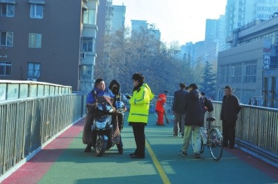 京華時(shí)報(bào)訊(記者張思佳)昨天,朝陽(yáng)呼家樓交通大隊(duì)的交警在雙井橋北一過(guò)街天橋上,對(duì)在天橋上騎行電動(dòng)車者進(jìn)行處罰,騎行者當(dāng)場(chǎng)被罰款20元。這是交管部門(mén)首次對(duì)電動(dòng)車騎行橫穿過(guò)街天橋進(jìn)行處罰。