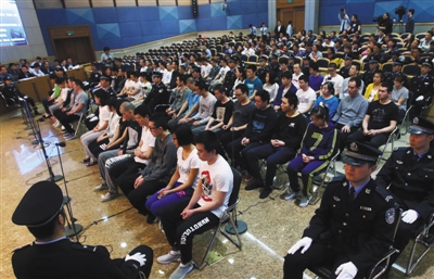 因?yàn)楸桓嫒颂?,法院最大的法庭也無(wú)法容納。開(kāi)庭前法院已將最大法庭前4排旁聽(tīng)席的座位拆下,以擴(kuò)大審判區(qū)的面積,同時(shí)從兄弟法院協(xié)調(diào)了法警30人,出動(dòng)了12輛警車(chē)接送被告人。