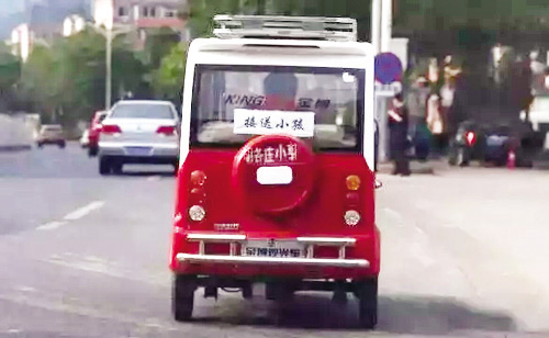 后窗玻璃貼著“接送小孩”字樣的老年代步車正在行駛。