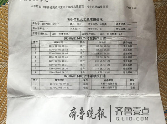 記者注意到,常升在7月5日上午9點(diǎn)51分登陸自己的賬號填報(bào)好了志愿之后便離開,但是當(dāng)天下午4點(diǎn)多,常升的賬號再次在同一臺電腦上登陸,而接下來賬號又在另外一個IP地址上連續(xù)登陸兩次,并且用完了兩次修改志愿的機(jī)會。“我就登陸過一次,在遲老師的電腦上?!背If,后面的三次操作他都不知道是誰所為。根據(jù)IP地址提供的線索,無論是誰修改了常升的志愿,都在遲老師的電腦上進(jìn)行過操作,然后又用另一臺電腦將常升的改志愿次數(shù)用完。常升的準(zhǔn)考證和密碼一直在自己手里保管,唯一有機(jī)會修改他志愿的就是自己的同窗好友郭某?!拔覀冴P(guān)系很好,我填志愿的時候他就在旁邊,我也沒防著他?!背If,事發(fā)之后他找過郭某,對方也私下承認(rèn)了修改了常升志愿的事實(shí),原因則是郭某擔(dān)心常升的分?jǐn)?shù)更高,他怕常升擠掉自己,讓自己沒學(xué)上。隨后,為了挽回常升的損失,雙方家長進(jìn)行了商談。圖為常升的賬號修改志愿的記錄。