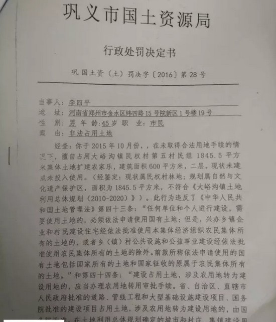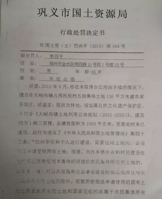 據(jù)記者獲取的材料顯示,2015年12月份,鞏義市國(guó)土資源局對(duì)李四平進(jìn)行處罰,案由為“非法占地”。李四平擅自占用集體土地126平方米,建設(shè)農(nóng)家樂(lè),土地性質(zhì)為林地。對(duì)其處罰為“自行拆除在非法占用的126平方米土地上新建的建筑物和其他設(shè)施,恢復(fù)土地原狀”“對(duì)非法占用的126平方米土地,按每平方米3元處以罰款,共378元。”