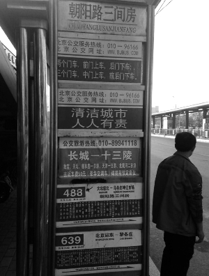 5日,記者來到朝陽區(qū)三間房公交車站,見站牌上除了488路、639路站牌和兩塊公益提示牌外,中間出現(xiàn)了一塊顯示著“公交旅游熱線,長城——十三陵”的牌子,牌子下方還有一排小字,寫著北京一些著名景點(diǎn)的一日游,往返車費(fèi)50元。記者注意到,不同于其他站牌,這塊公交旅游熱線為不干膠質(zhì)地,表面嶄新干凈,明顯剛粘貼上不久,而正規(guī)公交站牌則是不銹鋼的鋼板。