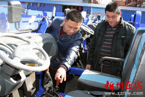 2月20日,原平市子干村的農(nóng)民正在農(nóng)機(jī)銷售處挑選時(shí)風(fēng)農(nóng)用車,春節(jié)過后,該市農(nóng)機(jī)市場(chǎng)紅紅火火,農(nóng)民們?cè)鐐涓瑸榻衲甑拇焊a(chǎn)打下良好基礎(chǔ)。(趙春曉 攝)