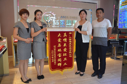 六月七日,忻州知名企業(yè)“山西福來(lái)珠寶有限公司”,向忻州市環(huán)衛(wèi)處全體環(huán)衛(wèi)工人捐贈(zèng)1300件價(jià)值近五萬(wàn)元的T裇衫,供環(huán)衛(wèi)工人夏季作業(yè)避暑,同時(shí)呼吁社會(huì)各界愛(ài)護(hù)環(huán)境衛(wèi)生,關(guān)愛(ài)環(huán)衛(wèi)工人。市環(huán)衛(wèi)處處長(zhǎng)石建新、副處長(zhǎng)張林霞一同出席捐贈(zèng)儀式,并代表市環(huán)衛(wèi)處向山西福來(lái)珠寶有限公司回贈(zèng)錦旗,以示感謝。