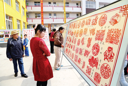 近日,靜樂縣利民小學舉辦校園書法、繪畫和剪紙作品展。據(jù)悉,此次活動共收到美術作品300 余件、書法作品300 余件、剪紙作品600 件。通過一件件作品表達了孩子們對美麗“中國夢”的憧憬。圖為學生和家長在參觀展覽。(閆曉梅 攝)