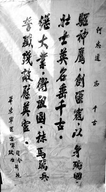 何忠道的犧牲,引起了整個(gè)空軍系統(tǒng)的震憾,人民空軍舉行了隆重的追悼大會(huì)??哲姍C(jī)關(guān)、華東軍區(qū)、生前所在部隊(duì)機(jī)關(guān)、戰(zhàn)友送了幾十幀挽幛??哲娝玖顔T劉亞樓、副司令員常乾坤、副政委吳法憲、參謀長(zhǎng)王秉璋聯(lián)名敬獻(xiàn)的挽幛上書(shū):“殲滅美國(guó)侵略者,堅(jiān)決保衛(wèi)祖國(guó)領(lǐng)空,為何忠道同志復(fù)仇!”華東軍區(qū)司令部、政治部敬獻(xiàn)的挽幛上書(shū):“驅(qū)神鷹,創(chuàng)飛寇,以身殉國(guó),壯士英名垂千古。創(chuàng)大業(yè),衛(wèi)祖國(guó),秣馬厲兵,誓殲殘敵慰英靈?!?/p>