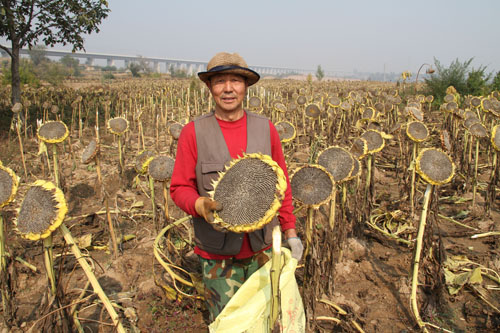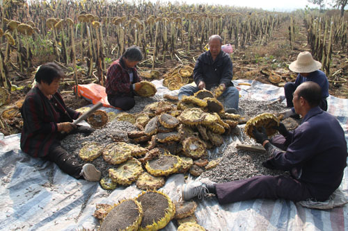 10月13日,原平市解村鄉(xiāng)圪坨村林同種植專業(yè)合作社正在收獲向日葵,該社引進(jìn)三瑞公司種植1000余畝SH363向日葵喜獲豐收。近年來,該市積極引導(dǎo)農(nóng)民調(diào)整農(nóng)業(yè)產(chǎn)業(yè)結(jié)構(gòu),采取“合作社+農(nóng)戶”的模式,向日葵比玉米收入高四倍,銷售價(jià)每斤4塊左右,合作社為農(nóng)戶提供種子、種植技術(shù)等服務(wù),帶動(dòng)當(dāng)?shù)厝罕娫鍪罩赂弧?span style="font-family: 楷體,楷體_gb2312, simkai">圖為解村鄉(xiāng)村民趁著秋高氣爽的晴好天氣,在田間地頭葵花籽的情景。(褚震 攝)