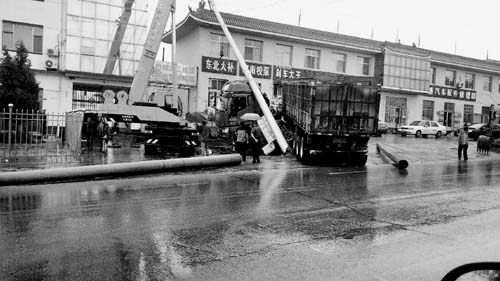 當(dāng)天夜里,五臺(tái)縣東冶鎮(zhèn)遭遇持續(xù)強(qiáng)降水天氣過(guò)程,公司調(diào)控中心值班員在凌晨3時(shí)22分發(fā)現(xiàn)10千伏829北大街線(xiàn)速斷掉閘,立刻電話(huà)通知所管轄區(qū)東冶供電所。得知情況后,該供電所組織搶修人員迅速趕往事故現(xiàn)場(chǎng),勘查電桿及線(xiàn)路受損情況。經(jīng)查勘,原來(lái)是一輛重型載貨卡車(chē)在駛經(jīng)五臺(tái)縣東冶鎮(zhèn)時(shí),因連夜大雨導(dǎo)致路面濕滑把一基電桿給撞倒了,斷裂的電桿壓在大卡車(chē)上,大卡車(chē)無(wú)法行駛。這一意外事件,造成了10千伏北大街線(xiàn)失電、沿線(xiàn)居民用電中斷。10千伏829北大街線(xiàn)是東冶鎮(zhèn)街道主要干線(xiàn),生產(chǎn)任務(wù)繁重,能否盡快恢復(fù)送電直接關(guān)乎沿線(xiàn)居民的切身利益。