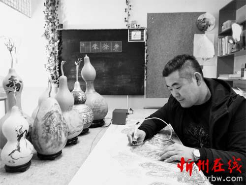 在定襄縣,有一個叫王燕軍的后生,他的愛好比較獨(dú)特,常手持一把小烙鐵,在葫蘆上熨出烙痕作畫,大家都親切地喊他“葫蘆娃”。王燕軍的這種工藝叫烙畫,又稱燙畫、火種刺繡、火筆畫,起源于漢代,興于唐宋,是一類極其珍貴的畫種。