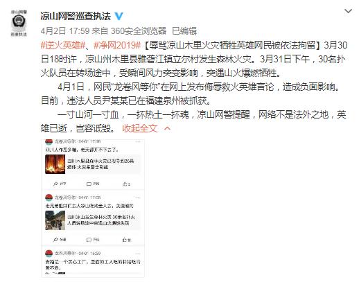 人民網(wǎng)北京4月3日電(記者孝金波 實(shí)習(xí)生張琳)3月30日18時(shí)許,涼山州木里縣雅礱江鎮(zhèn)立爾村發(fā)生森林火災(zāi),30名撲火隊(duì)員在轉(zhuǎn)場(chǎng)途中,突遇山火爆燃犧牲。悲痛之際,有網(wǎng)民舉報(bào)“一名叫‘龍卷風(fēng)等你’的賬戶(hù)竟在轉(zhuǎn)發(fā)撲火人員犧牲的消息時(shí)發(fā)布侮辱言論”,4月2日晚,涼山網(wǎng)警通告稱(chēng),發(fā)布侮辱言論的尹某某已在福建泉州被抓獲。