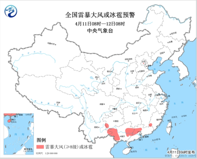 預(yù)計4月11日08時至12日08時,貴州西南部、福建西南部、廣西西部和東部、廣東西北部等地的局地將有8-10級雷暴大風(fēng)或冰雹天氣;此外,貴州西南部、福建西部、廣西大部、廣東中北部等地的部分地區(qū)將有短時強(qiáng)降水天氣,小時雨強(qiáng)20-40毫米,局地可達(dá)50毫米以上。