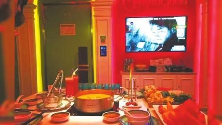 位于成都青羊區(qū)的一家KTV,旗幟鮮明地打起了“火鍋KTV”的招牌。“8葷5素,線上直接下單,火鍋直接送進包廂?!惫ぷ魅藛T正在向顧客介紹。