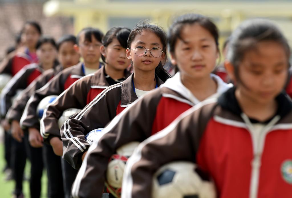 ↑這是學(xué)生們在做足球操(4月18日攝)。新華社記者詹彥攝