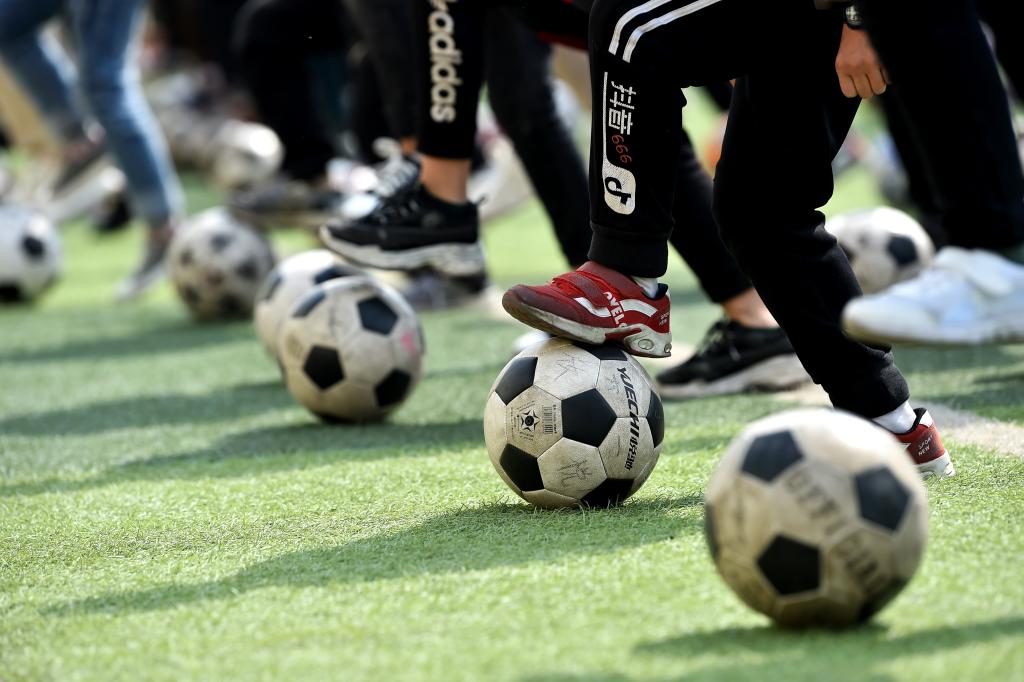 ↑這是學(xué)生們?cè)谇驁?chǎng)上進(jìn)行足球訓(xùn)練(4月18日攝)。新華社記者詹彥攝