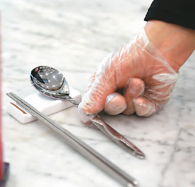 在北京市朝陽大悅城一家餐飲店內(nèi),食客隔位而坐,餐具“公私”分明?!伴_始使用公筷、公勺時,有點不習(xí)慣,不過現(xiàn)在已經(jīng)適應(yīng)了,分著吃更安全。”在店內(nèi)用餐的黃先生說。