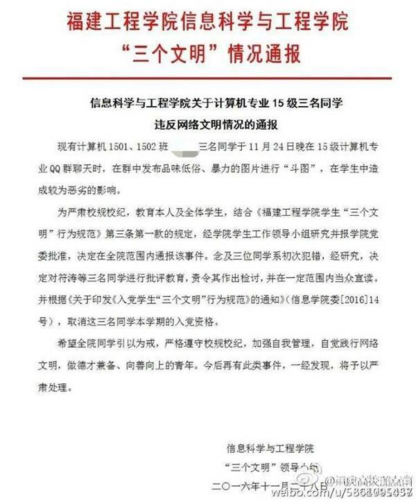 11月29日,微博號“福州大學(xué)城新鮮事”發(fā)布《厲害了工院!學(xué)生“斗圖”被通報(bào)批評》一文,并貼出《信息科學(xué)與工程學(xué)院關(guān)于計(jì)算機(jī)專業(yè)15級三名同學(xué)違反網(wǎng)絡(luò)文明情況的通報(bào)》(以下簡稱《通報(bào)》),引起網(wǎng)友熱議,有人稱“學(xué)校小題大做”。
