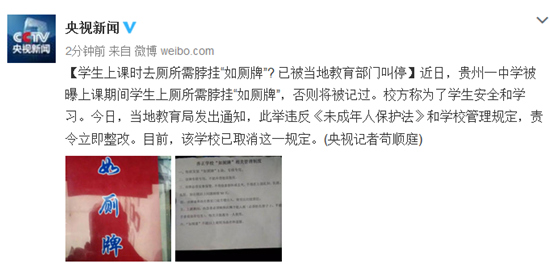 近日,貴州一中學(xué)被曝上課期間學(xué)生上廁所需脖掛“如廁牌”,否則將被記過(guò)。校方稱為了學(xué)生安全和學(xué)習(xí)。今日,當(dāng)?shù)亟逃职l(fā)出通知,此舉違反《未成年人保護(hù)法》和學(xué)校管理規(guī)定,責(zé)令立即整改。目前,該學(xué)校已取消這一規(guī)定。