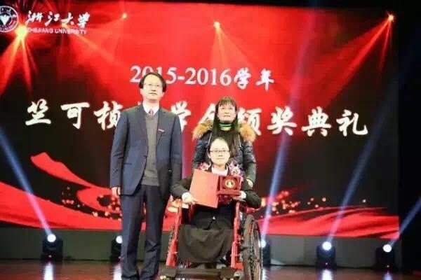 竺可楨獎學金是浙江大學最高層次的獎學金,要通過本人申請,學院(系)推薦,校獎學金評審委員會評定,每次評選全校范圍內(nèi)的研究生只有12個名額。在2016年10月份公布的獲獎?wù)咧校~沈俏名列其中。“自己算比較幸運的,還能看書,可以打字?!比~沈俏說,“同學和老師還是很關(guān)愛我的,努力學習、認真科研是向他們表達感謝的手段,這也是我最好的興趣?!眻D為浙江大學校長吳朝暉為葉沈俏頒發(fā)竺可楨獎學金。