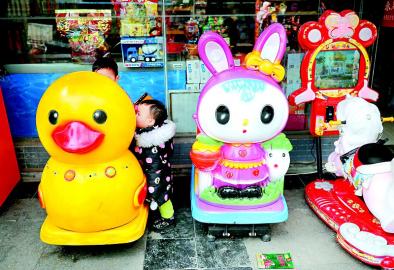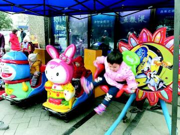 放在商店前的搖搖車等街頭小型游樂設施,因乘坐價格便宜、造型卡通、色彩鮮艷,帶給低齡小朋友樂趣,受到不少小朋友的歡迎,圖為兩個小朋友搶坐一臺搖搖車。 本報記者