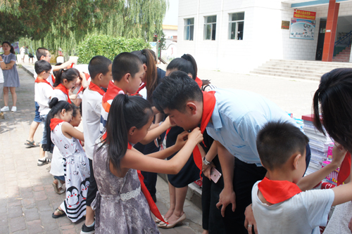活動現(xiàn)場,公司職工在董事長張紫涵的帶領(lǐng)下同孩子們一起升國旗,進(jìn)行學(xué)習(xí)用品的捐贈,并勉勵他們好好學(xué)習(xí),天天向上。為表示感謝,孩子們把紅領(lǐng)巾親自給叔叔阿姨們系上,學(xué)校校長張喜年也把一面“愛心捐助,善行義舉”的錦旗送到董事長張紫涵的手中。(李濤 攝)
