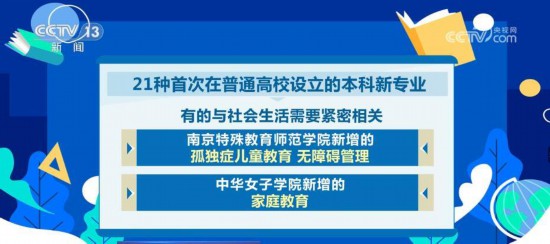 21種首次在普通高校設(shè)立的本科新專業(yè),有的與社會(huì)生活需要緊密相關(guān),比如南京特殊教育師范學(xué)院新增的孤獨(dú)癥兒童教育、無障礙管理,中華女子學(xué)院新增的家庭教育;有的與城鄉(xiāng)建設(shè)緊密相關(guān),比如海南大學(xué)新增的鄉(xiāng)村治理,北京林業(yè)大學(xué)新增的國家公園建設(shè)與管理;還有的與前沿技術(shù)發(fā)展緊密相關(guān),比如,清華大學(xué)新增的地球系統(tǒng)科學(xué),華南理工大學(xué)新增的生物材料,東南大學(xué)新增的未來機(jī)器人、電動(dòng)載運(yùn)工程。