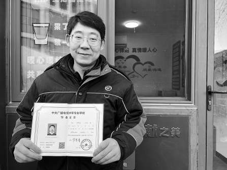 聽說學員通過考試后可以獲得國家承認的成人中專畢業(yè)證書,學習費用全部由街道補貼,蔣風登立刻動了心。在工作人員的幫助下,他報名學習計算機應用專業(yè),開始了半工半讀的生活。晚上下班回到家,他一遍遍地刷著網(wǎng)課;白天,他利用送快遞的間隙鞏固知識點。經(jīng)過一年的學習,2024年3月,他順利拿到了畢業(yè)證。
