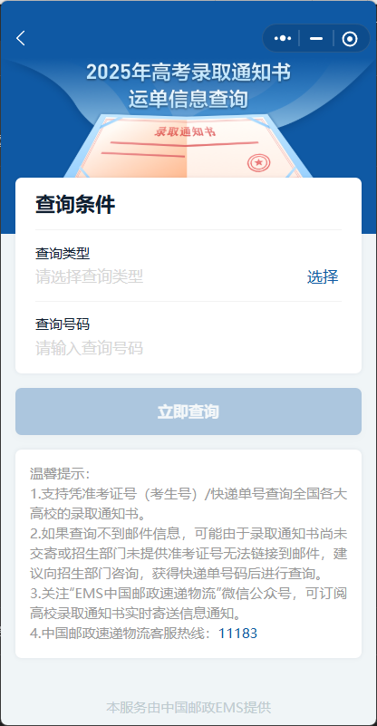 考生可以通過國務(wù)院客戶端小程序,進(jìn)行高考錄取通知書運單信息查詢。?