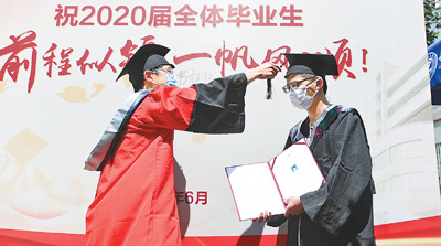接過學位證書,本科畢業(yè)生蔡杰和院長拍了一張合影。他說:“沒有遺憾了,這個畢業(yè)典禮特殊而完美!”