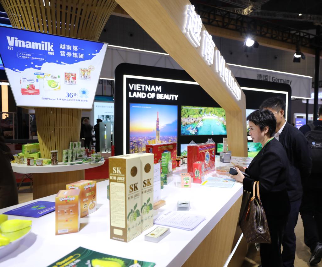 11月6日,參觀者在第六屆進博會國家展越南展臺挑選商品。