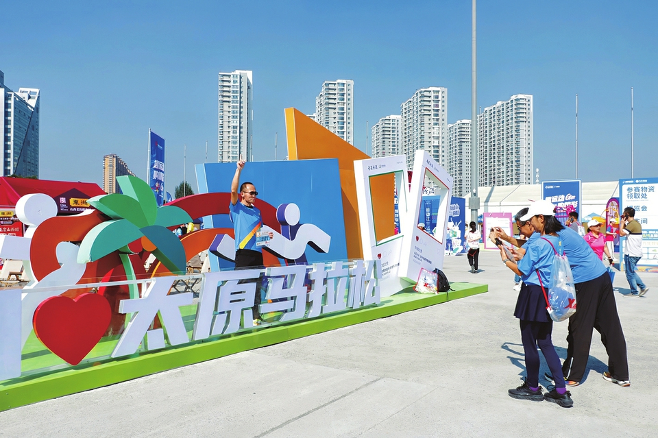 9月19日,2024太原體育消費(fèi)周啟動儀式在省城晉陽湖國際會展中心舉行。圍繞開賽在即的太原馬拉松賽,體育消費(fèi)周在該中心推出互動娛樂游戲、文體產(chǎn)品展示銷售、特色美食市場等十余項(xiàng)特色活動。圖為參賽選手在展板前拍照留念。