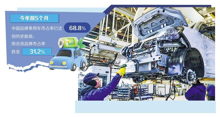 電動化與智能化變革浪潮,不僅在加速汽車產(chǎn)品進(jìn)化,也在深刻重構(gòu)市場競爭格局。中汽協(xié)數(shù)據(jù)顯示,今年前5個(gè)月,中國品牌乘用車市占率已達(dá)68.8%,創(chuàng)歷史新高;而合資品牌市占率跌至31.2%,創(chuàng)出新低。