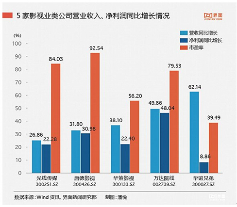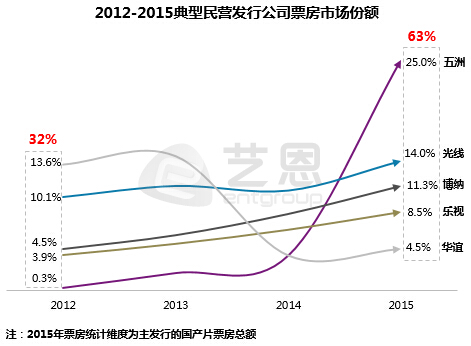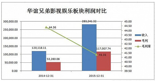 據(jù)界面報(bào)道,根據(jù)財(cái)報(bào)顯示,華誼兄弟2015年影視娛樂(lè)版塊營(yíng)業(yè)收入較上年同期相比增135.80%,達(dá)到28.32億元,營(yíng)業(yè)成本較上年同期增長(zhǎng)135.80%,達(dá)到16.62億,毛利率較上年減少了3.05%,達(dá)到41.35%。在報(bào)告期內(nèi),公司上映的主要是《奔跑吧兄弟》《天將雄師》《梔子花開(kāi)》、《命中注定》《尋龍?jiān)E》《老炮兒》等16部,電影的總票房約43億。 根據(jù)藝恩研究報(bào)告顯示,華誼兄弟從2012年的13.6%的市場(chǎng)份額一路跌至2015年的4.5%,而由萬(wàn)達(dá)影視牽頭的五洲發(fā)行市場(chǎng)份額一路從0.3%飆升至25%,華誼的電影份額被一路碾壓。而萬(wàn)達(dá)影視也即將以注入上市公司的方式登陸A股市場(chǎng)。