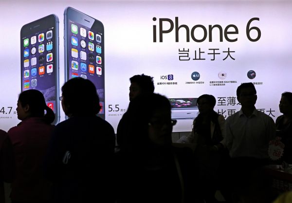 2014年10月17日,顧客在江西南昌的一家蘋果授權(quán)經(jīng)銷店門口排隊(duì),等待購買iPhone6和iPhone6 Plus手機(jī)。 (新華社發(fā))