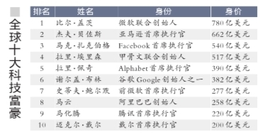 中國內地19位富豪進入這份榜單,包括阿里巴巴馬云、騰訊馬化騰、百度李彥宏、網易丁磊、小米雷軍等均有上榜。其中,阿里巴巴董事局主席馬云以258億美元排名第八,騰訊創(chuàng)始人馬化騰以220億美元排名第九。