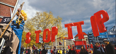 自2013年歐盟和美國(guó)啟動(dòng)《跨大西洋貿(mào)易與投資伙伴關(guān)系協(xié)定》(TTIP)談判以來(lái),歐洲國(guó)家的反對(duì)和抗議聲不絕于耳。圖為今年4月,德國(guó)民眾走上街頭抗議TTIP談判。